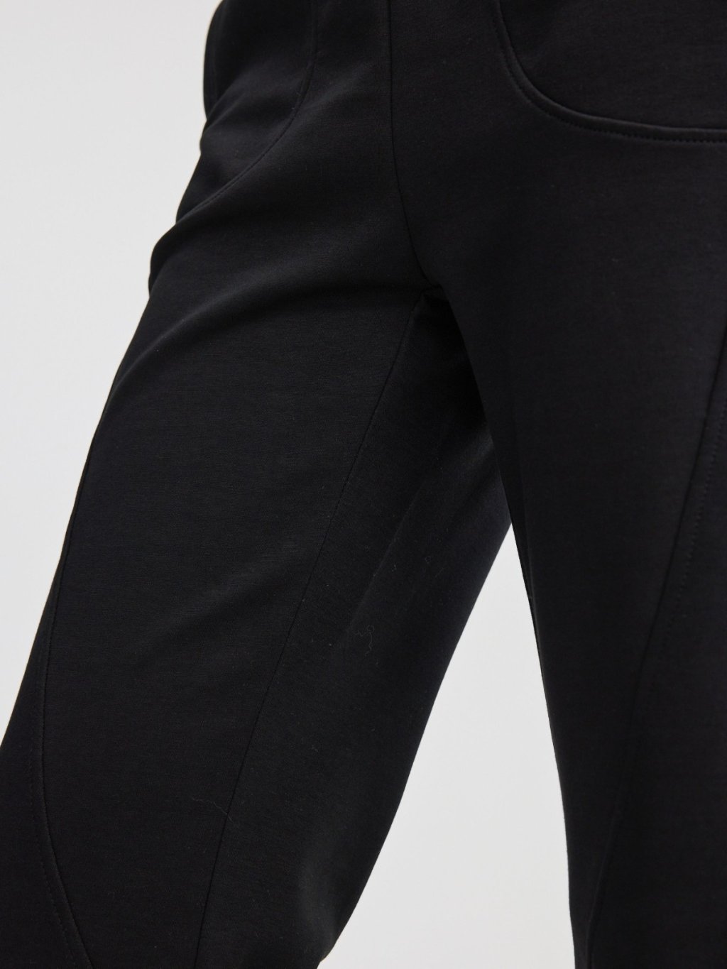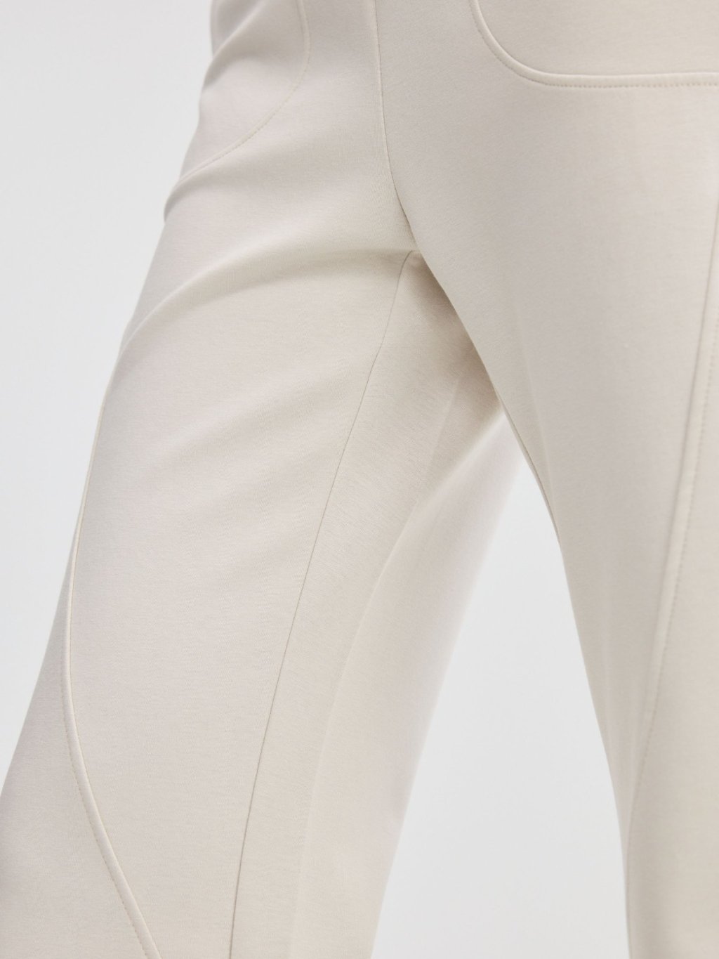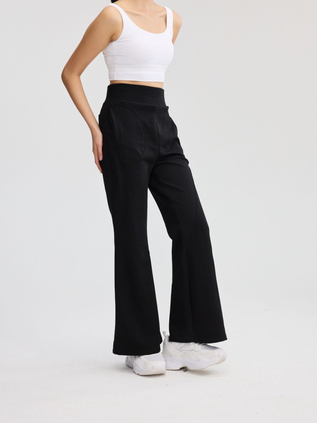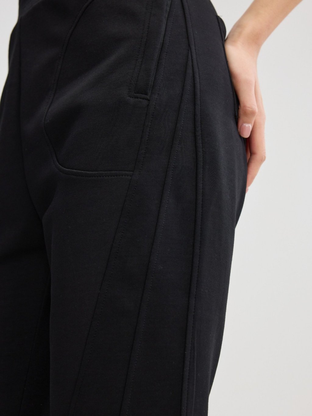褲身綴以多道立體斜線車縫,不僅強化了設計感,更在視覺上有效修飾與拉長腿部線條。臀部創新的立體貼袋設計,巧妙提升臀形,展現豐盈翹挺的視覺效果。