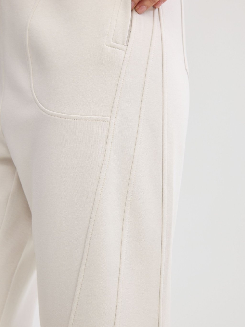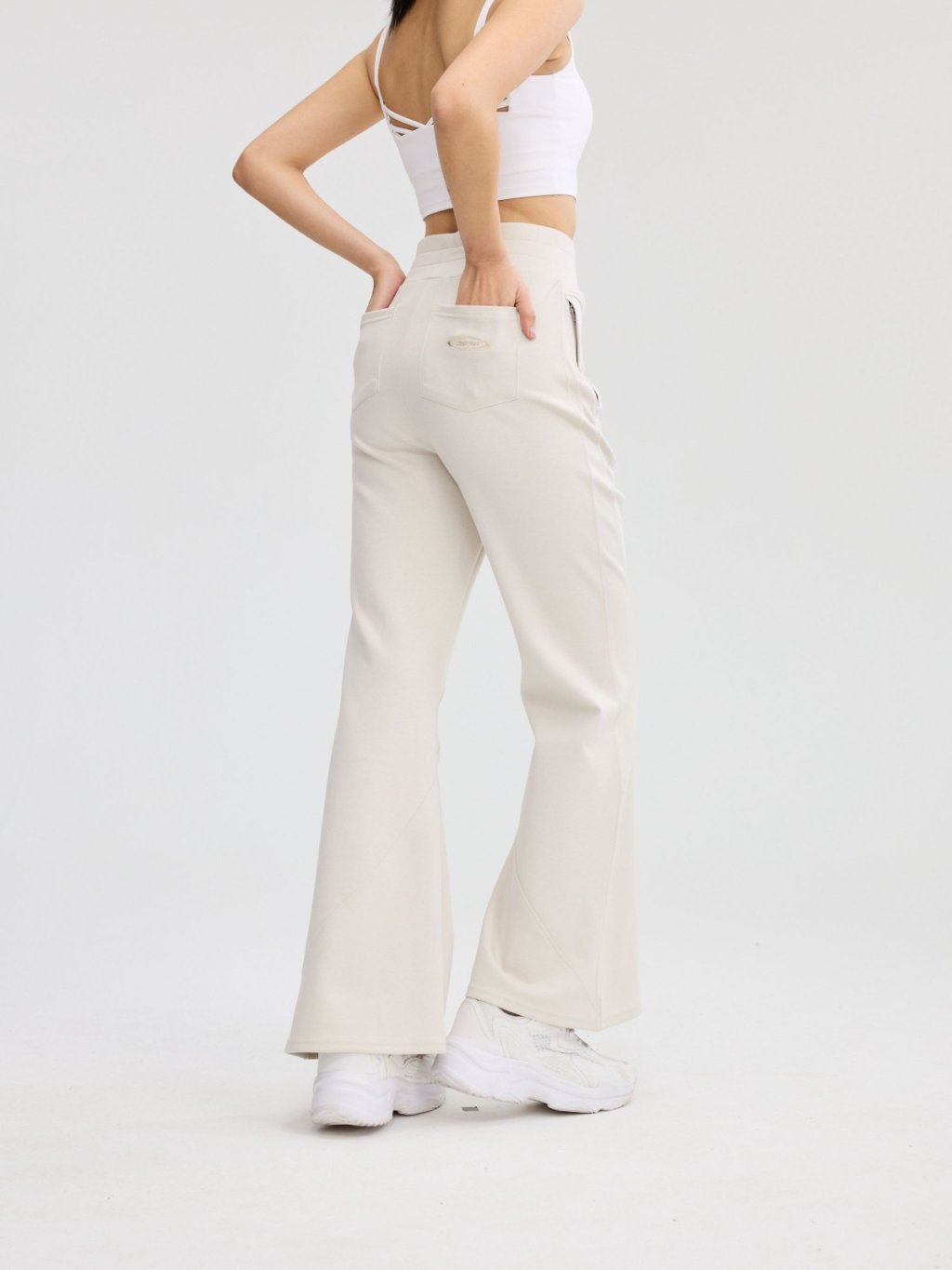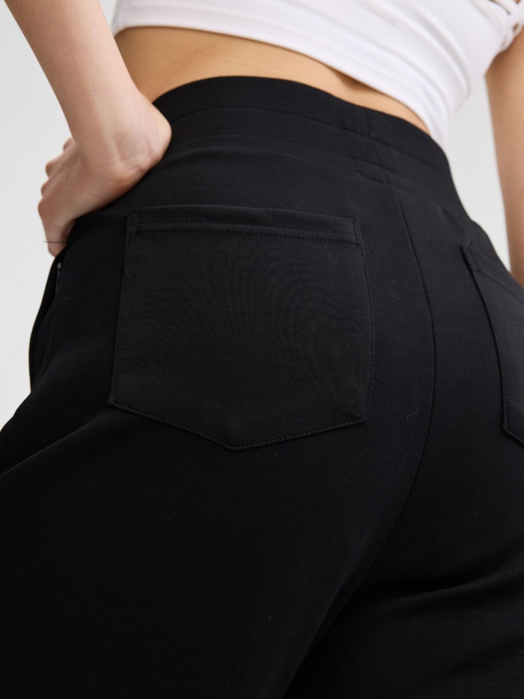 褲身綴以多道立體斜線車縫,不僅強化了設計感,更在視覺上有效修飾與拉長腿部線條。臀部創新的立體貼袋設計,巧妙提升臀形,展現豐盈翹挺的視覺效果。